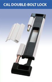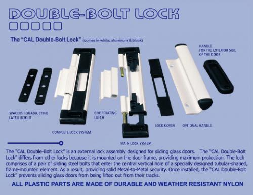 The CAL Double-Bolt Lock works by securing the door to the frame at 2 security points and preventing any movement of the door. With its double locking action the CAL Double-Bolt Lock makes it virtually impossible to remove the door by lifting it off its track. When the Double-Bolt is locked it's locked period. The Cal Double-Bolt Lock is elegant durable and permanent. Above all, its felexable mounting options, The Cal Double Bolt Lock can be installed anywhere along the door opening to maximize security, safety and convenience. Once installed, the locks break-through design makes a sliding glass door virtually Burglar Resistant.