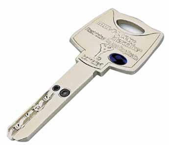 The Interactive patented key and key blank provide increased control over key cutting to achieve an even higher level of key security. Additional keys are cut after presentation of a Mul-T-Lock key card and verification of customer identity in accordance with Mul-T-Lock key cutting procedures, which may be obtained through professional Mul-T-Lock locksmiths. Interactive technology is retro-compatible with the Mul-T-Lock Classic system, allowing existing locks to be upgraded.